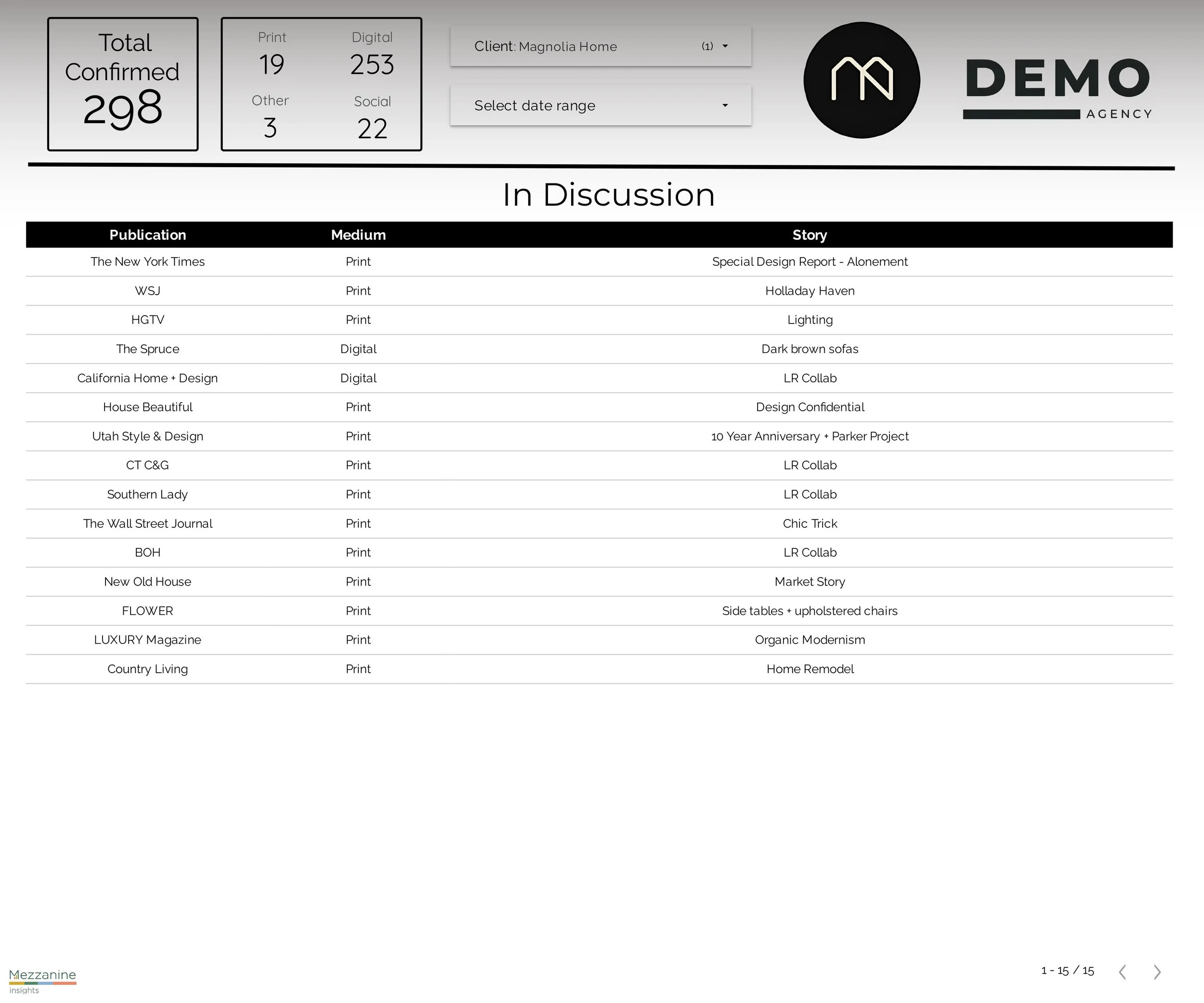 Demonstrate your team's proactive approach to securing press. The 'In Discussion' section highlights your pipeline of potential press placements, proving your ability to identify and cultivate new opportunities.